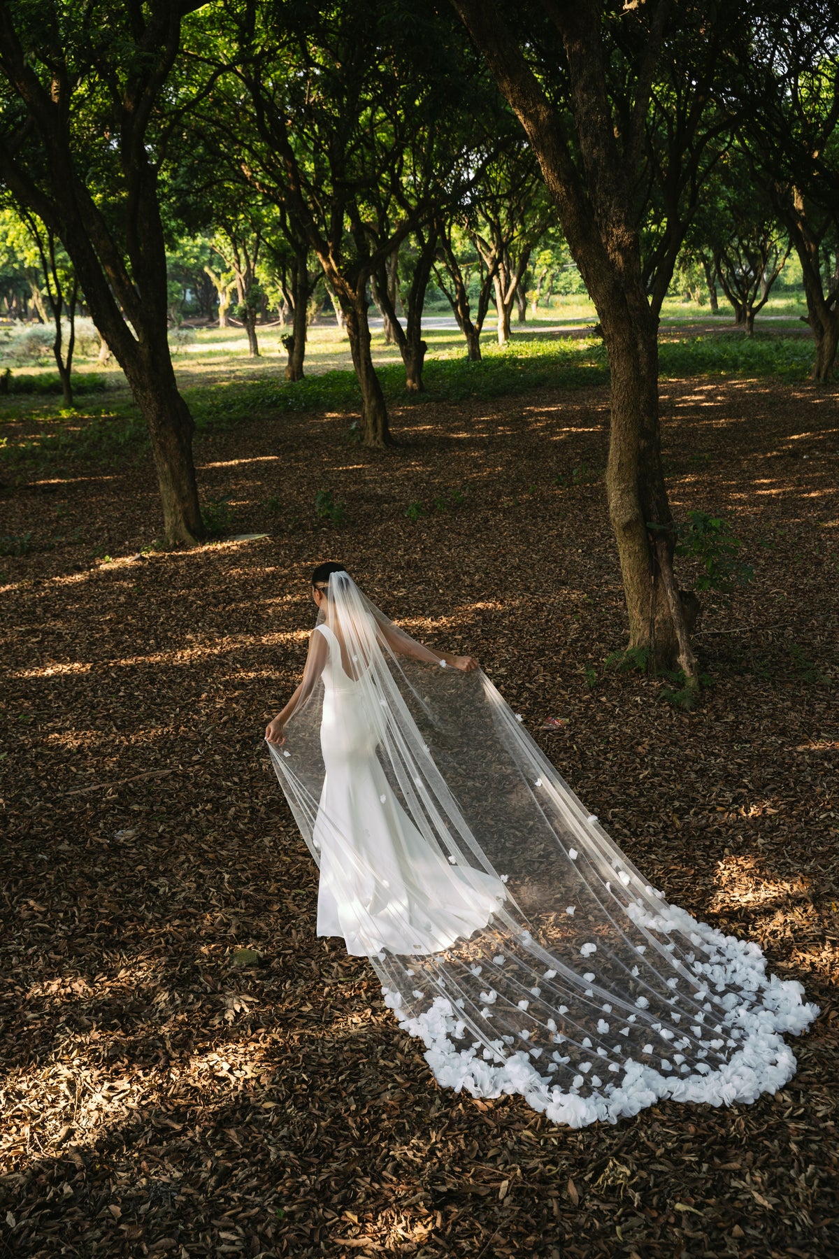 This veil pairs perfectly with simple, minimalistic, and plain dress styles. Its royal cathedral length creates an elegant and romantic effect, making it ideal for gowns with clean lines, such as A-line or sheath dresses. The Bella Veil complements dresses that feature modest embellishments, allowing the delicate floral details to take center stage.