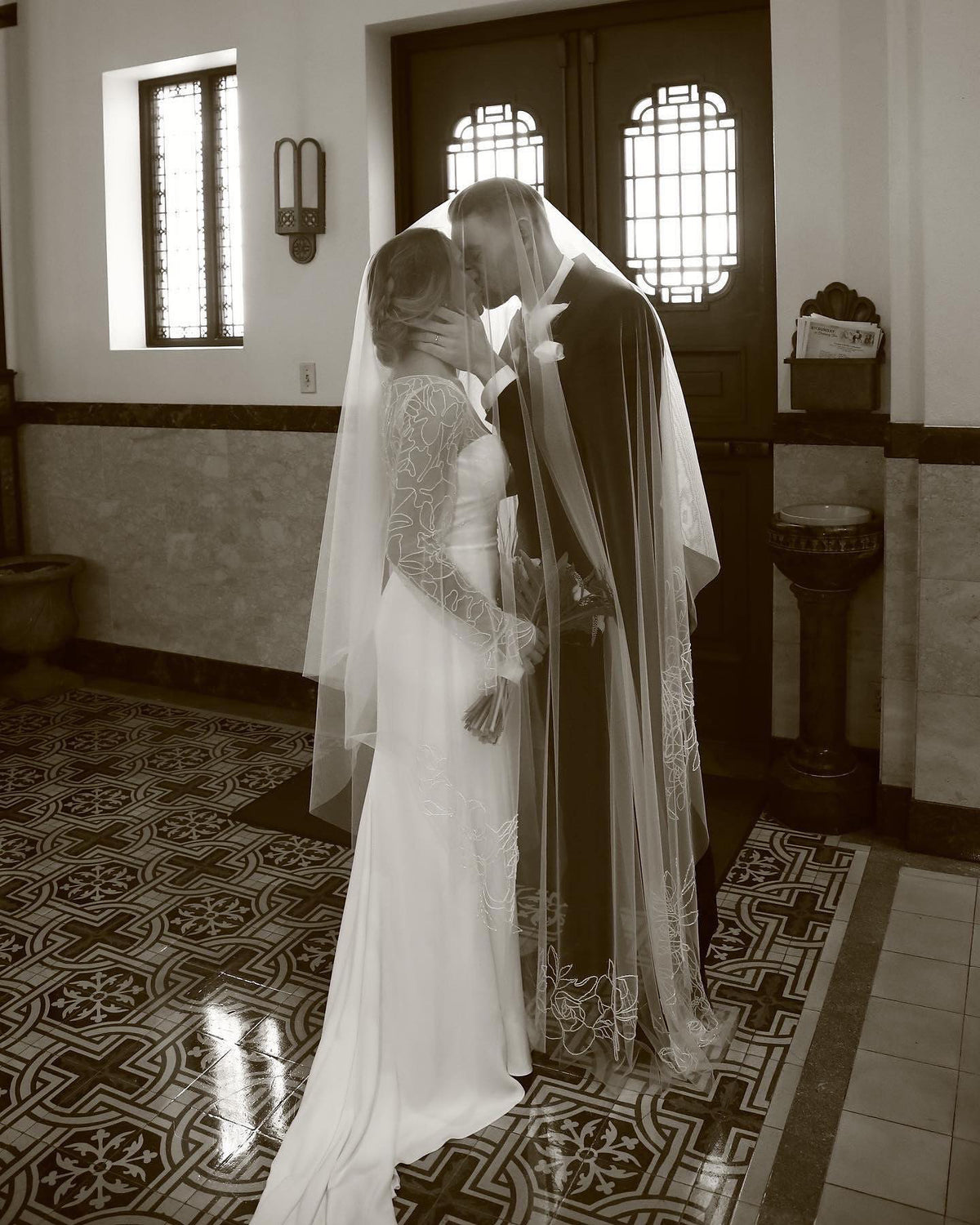 Accessory Pairing Tips: Keep jewelry minimal to allow the veil to shine. Opt for delicate earrings or a simple bracelet that complements the floral details without drawing attention away from the veil.