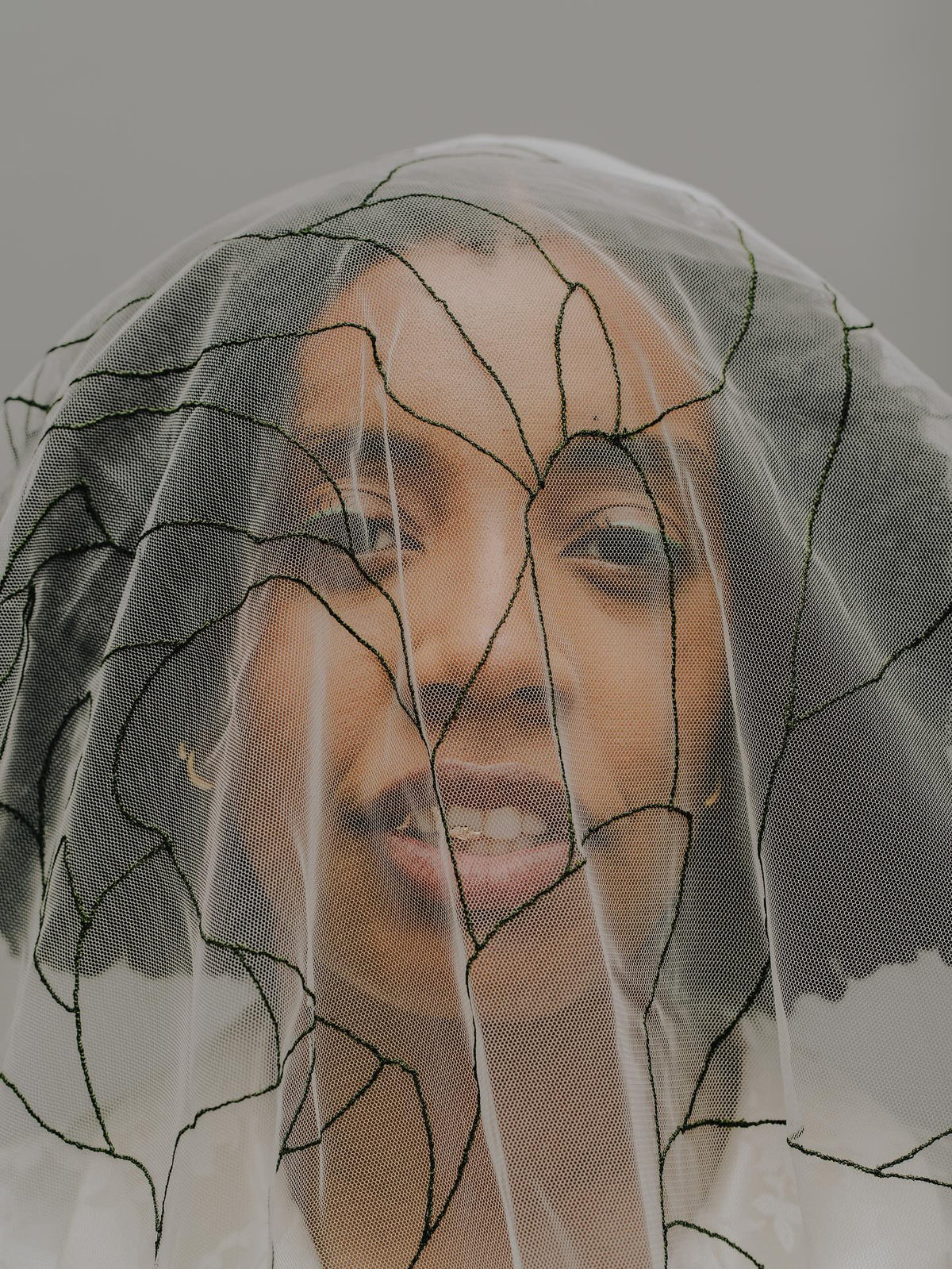 EMMA Veil | Dark green line floral embroidered veil - White / Black / Chapel: 90 inches