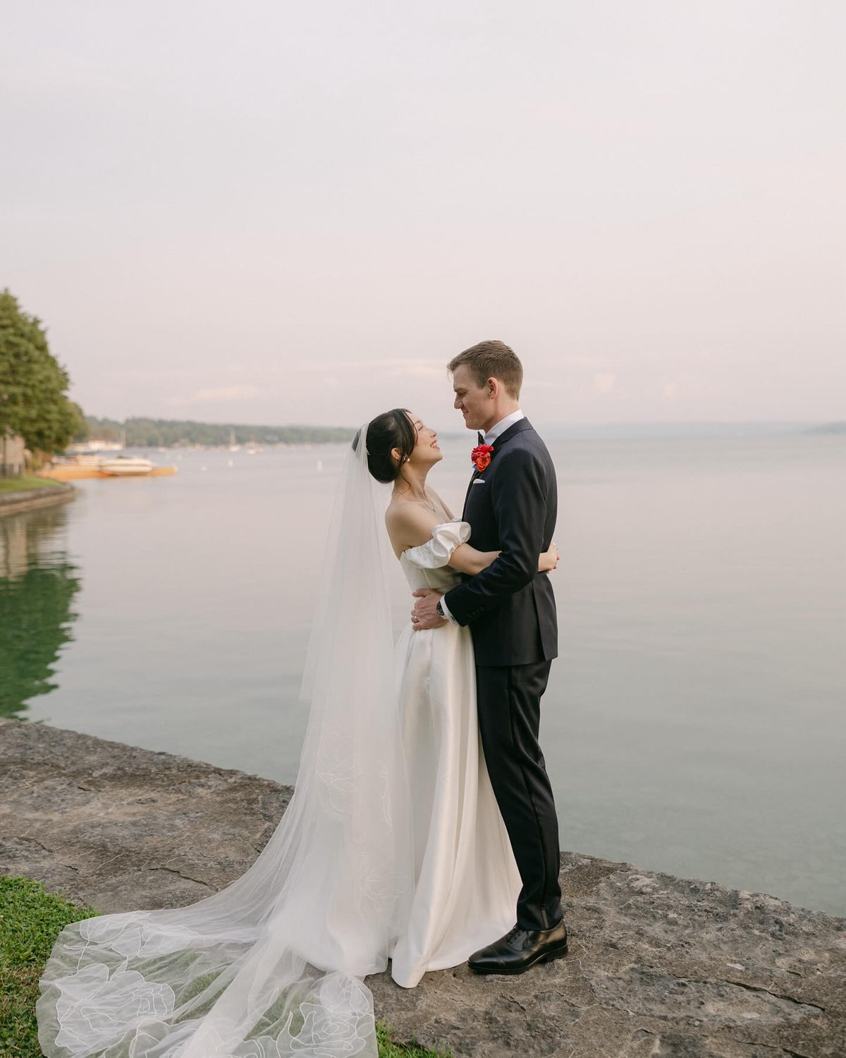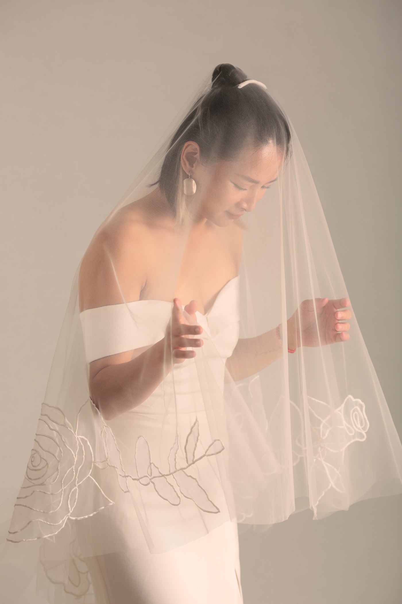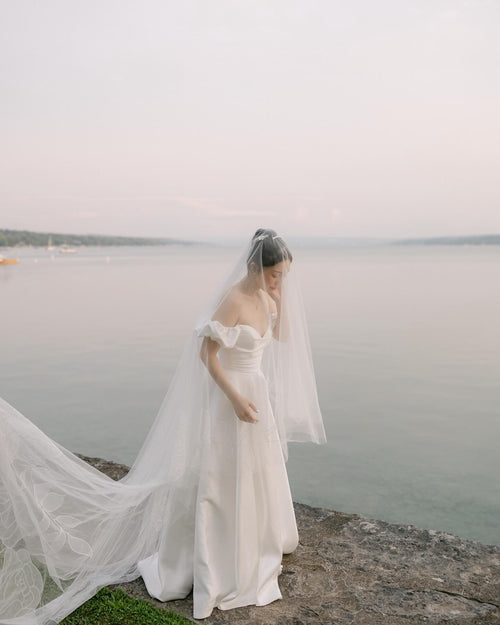 Rosie pairs beautifully with gowns that are simple, minimal, and unembellished , such as sleek satin columns, clean A lines, or structured strapless silhouettes. However, we can provide the right length for any veil you love. The veil’s romantic embroidery brings just the right amount of softness and movement. Chapel length suits classic venues like churches or intimate villas. Style with a low chignon or tucked waves and soft drop earrings. Since Rosie is already a statement, keep accessories light. A delicate gold bracelet or small stud earrings are all you need.